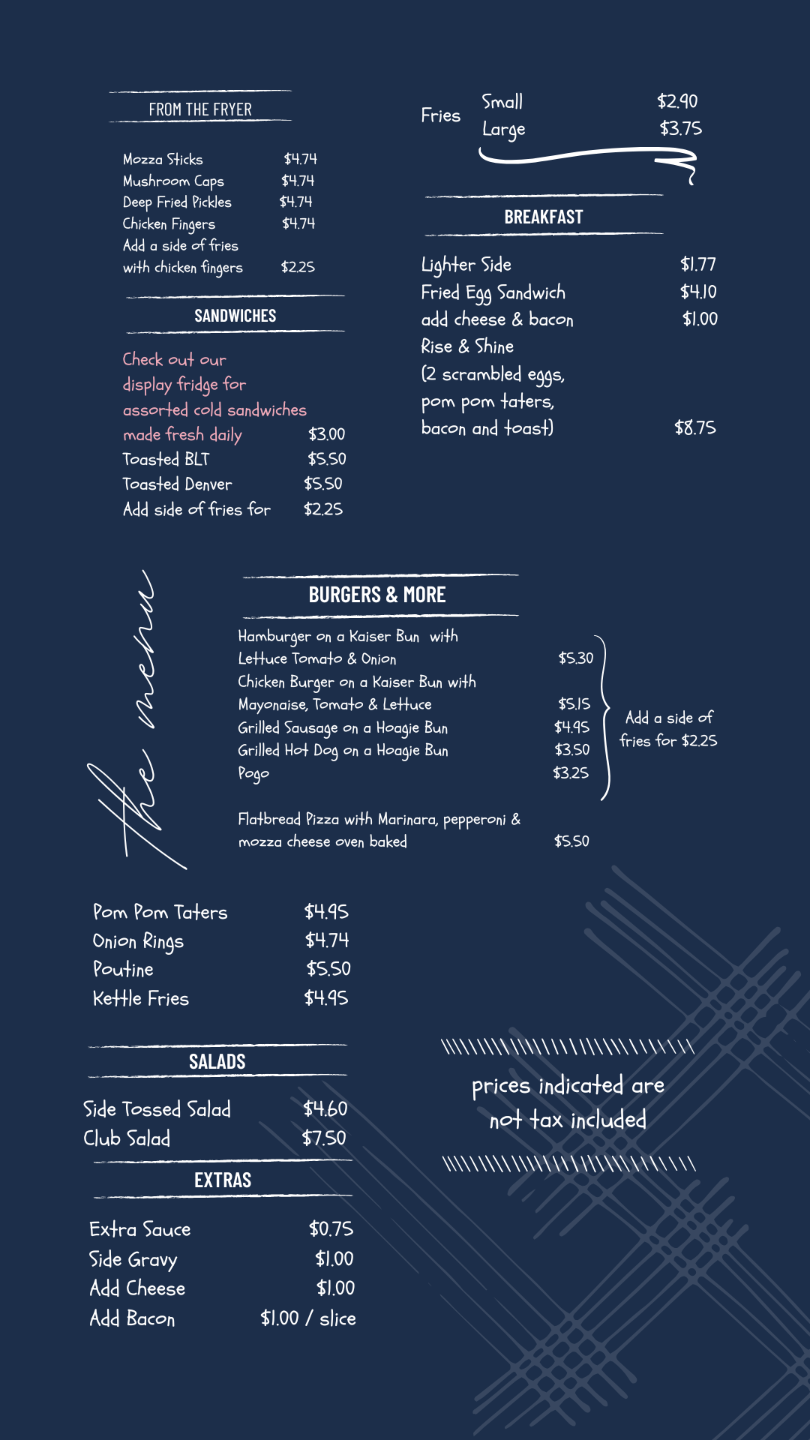 Our restaurant menu offers a great selection of snacks, meals, and sandwiches including soup of the day, chicken fingers, mozza sticks, daily sandwiches, burgers, salads, all-day breakfast, and more. Check out our daily specials, or view our full menu here!